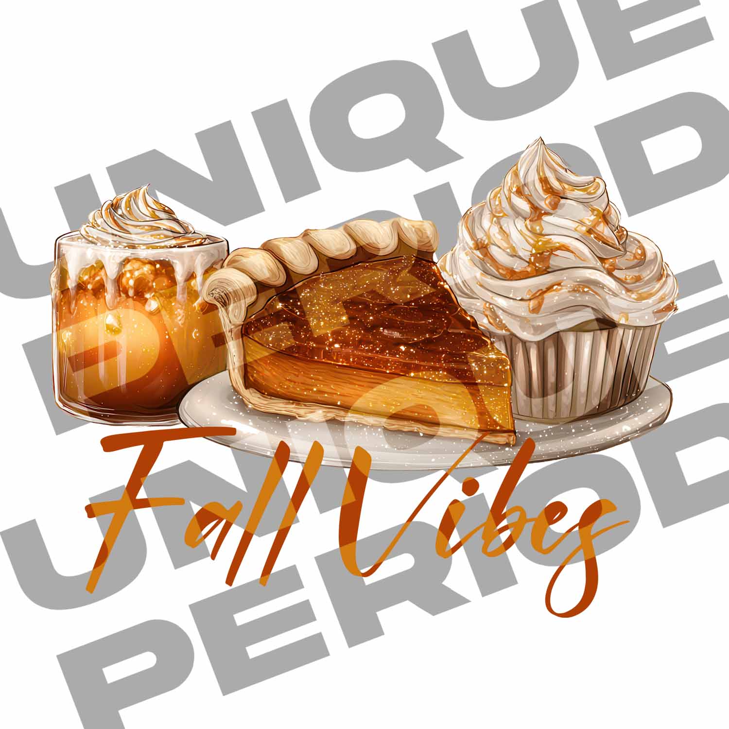 Cozy up this season with our Fall Vibes design — a rich autumn-inspired illustration featuring a caramel-drizzled latte, a decadent slice of pie, and a whipped-cream topped cupcake sparkling with sweetness. This design captures the essence of fall and is perfect for seasonal products, from tumblers and apparel to stickers, mugs, and more. Delivered as a high-resolution PNG with a transparent background, it’s easy to use for both print and digital projects.