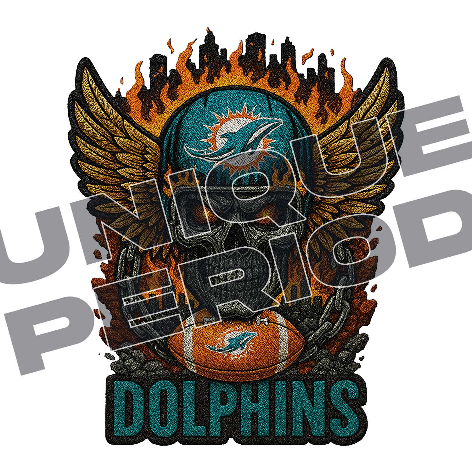 Fins up with edge in the Miami Dolphins Skull Patchish design. A skull-style patch look built for Miami fan apparel.