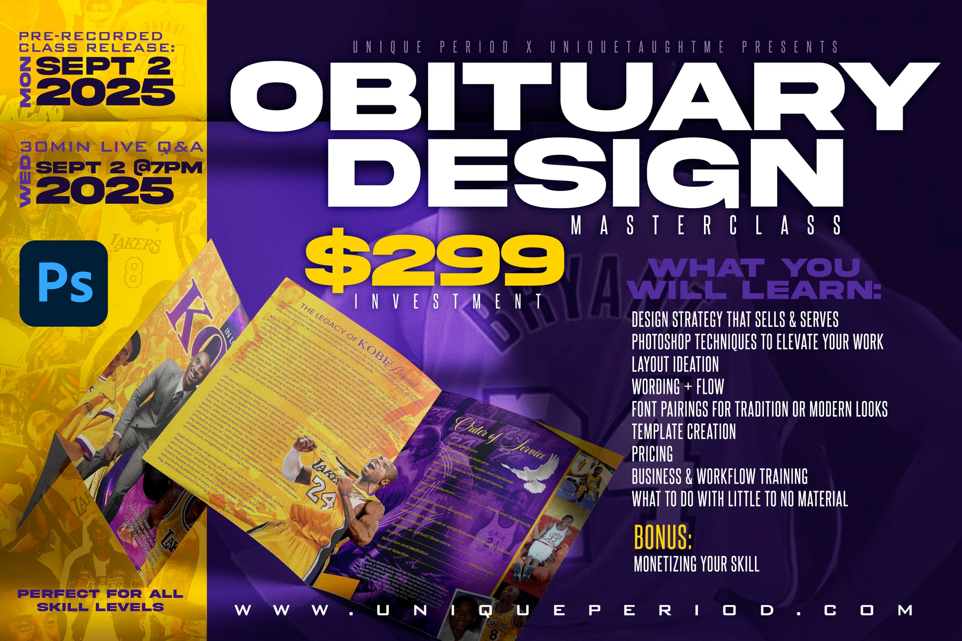 This self-paced, pre-recorded masterclass teaches you how to create stunning, print-ready obituary programs in Photoshop — the kind that comfort families and grow your design business.